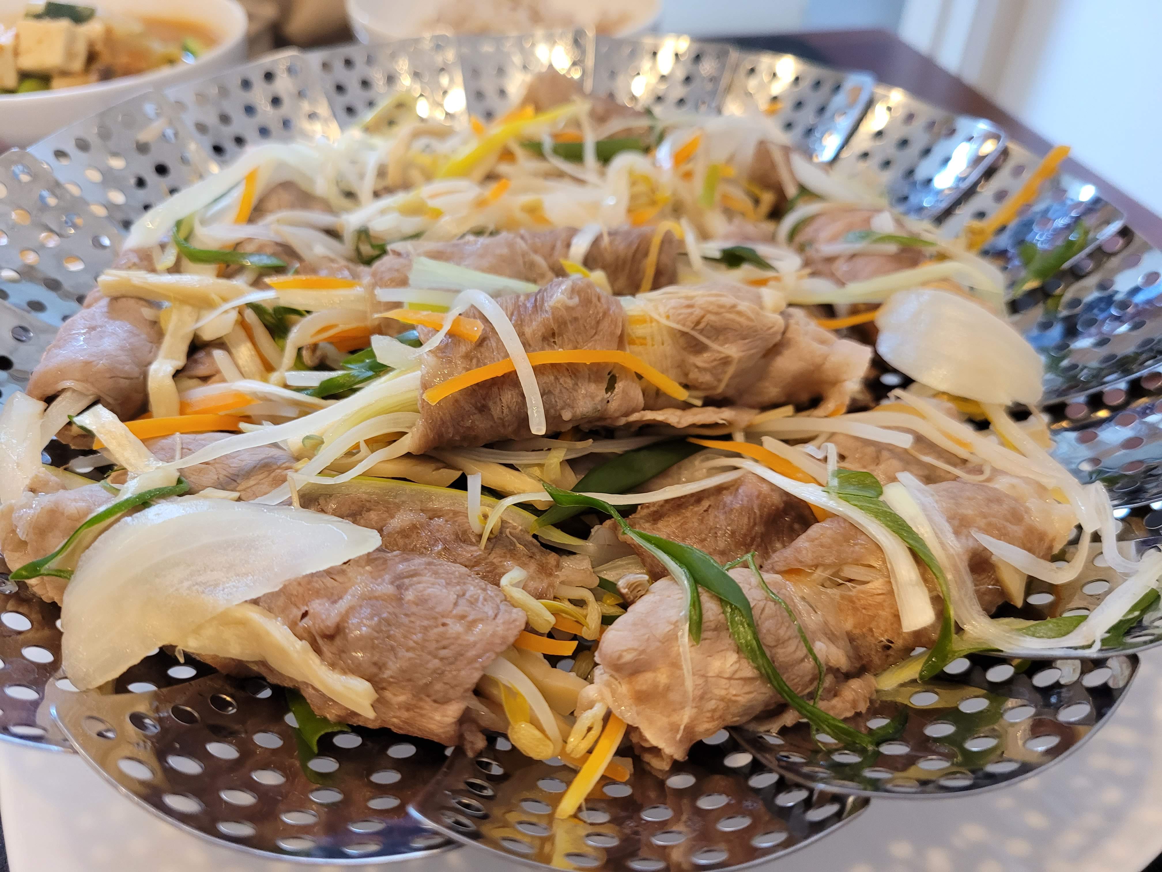 3. 찜틀에 소고기야채말이를 올려놓는다(아래사진 참고).